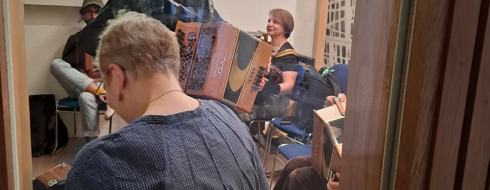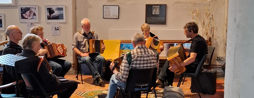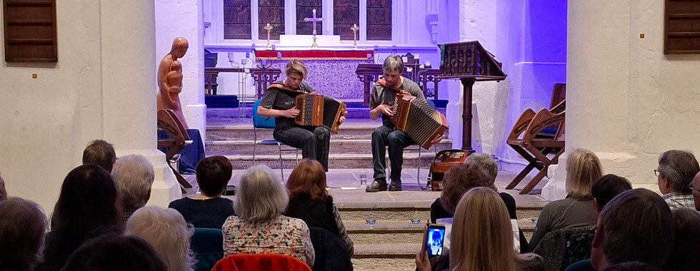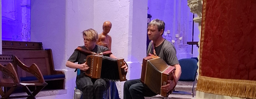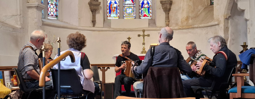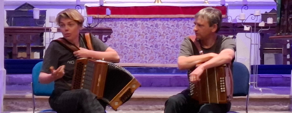 On the day, mischief and magic sparkled in the cool, sun-washed air of St Mary’s Church as workshop participants arrived to spend two happy hours with Anne and Andy. The excitement and mild panic we sensed from these box players reminded us of the people who came to the improvisation workshops with Peter Knight last year.