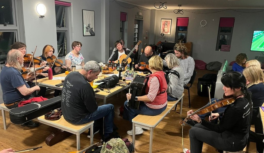 As amateur musicians, one of the commonest settings we encounter for playing folk music together is in small, multi-instrument groups, such as in pub sessions, or as a local ceilidh or morris band. So why do most workshops for folk musicians separate us into single instrument groups? Luckily for us, the Big Workshop Weekend tutors, John Dipper, Dave Malkin, Archie Churchill-Moss and Tom Moore thought this question was well worth pondering……